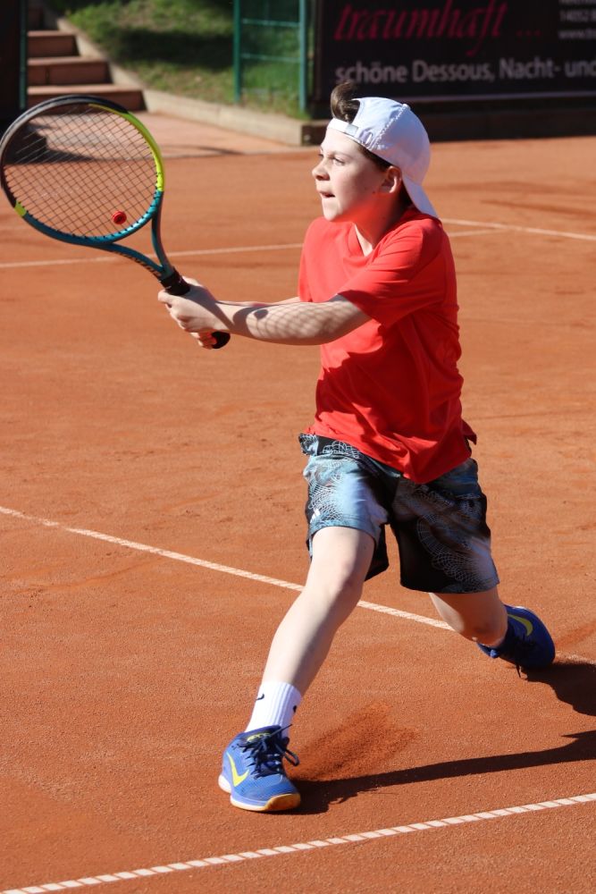U14 männlich: Obwohl Bruno Körnig (SV Dresden-Mitte) leicht favorisiert ins Finale ging, nutzte Karl-Lennard Schoenheit (SCC) seinen physischen Vorteil und sein druckvolles Spiel konsequent aus (6:2, 6:4).