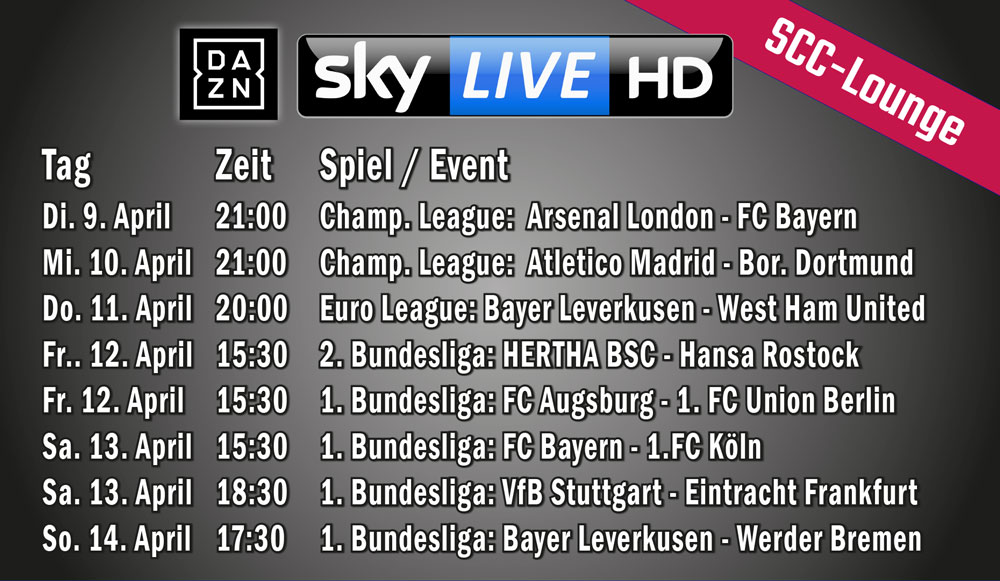 Hier seht Ihr unseren jeweils aktuellen TV-Wochenplan. Die genannten Spiele/Matches werden auf unserem Beamer in der Lounge gezeigt. Dazu wird es immer ein paar Snacks bei den oben ausgewählten Spielen geben. Auf den TV-Screens kann zusätzlich das Programm, welches gewünscht wird. Von den besten Tennismatches über Formel 1 bis Eishockey.